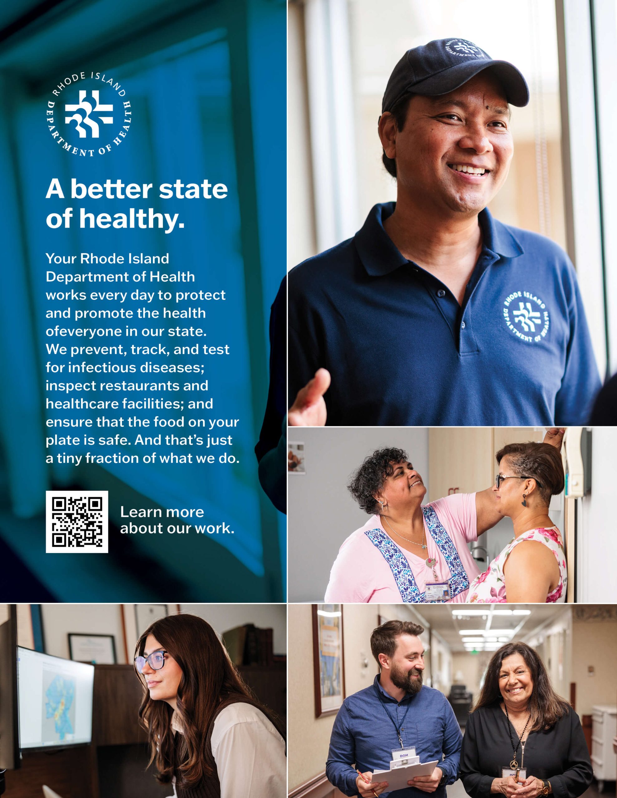 To help the Rhode Island Department of Health strengthen its position in the community, we created a campaign that features real employees and describes their work in a wide variety of areas. It all serves to educate the audience about the people whose mission is to keep everyone in the state as safe and healthy as possible.